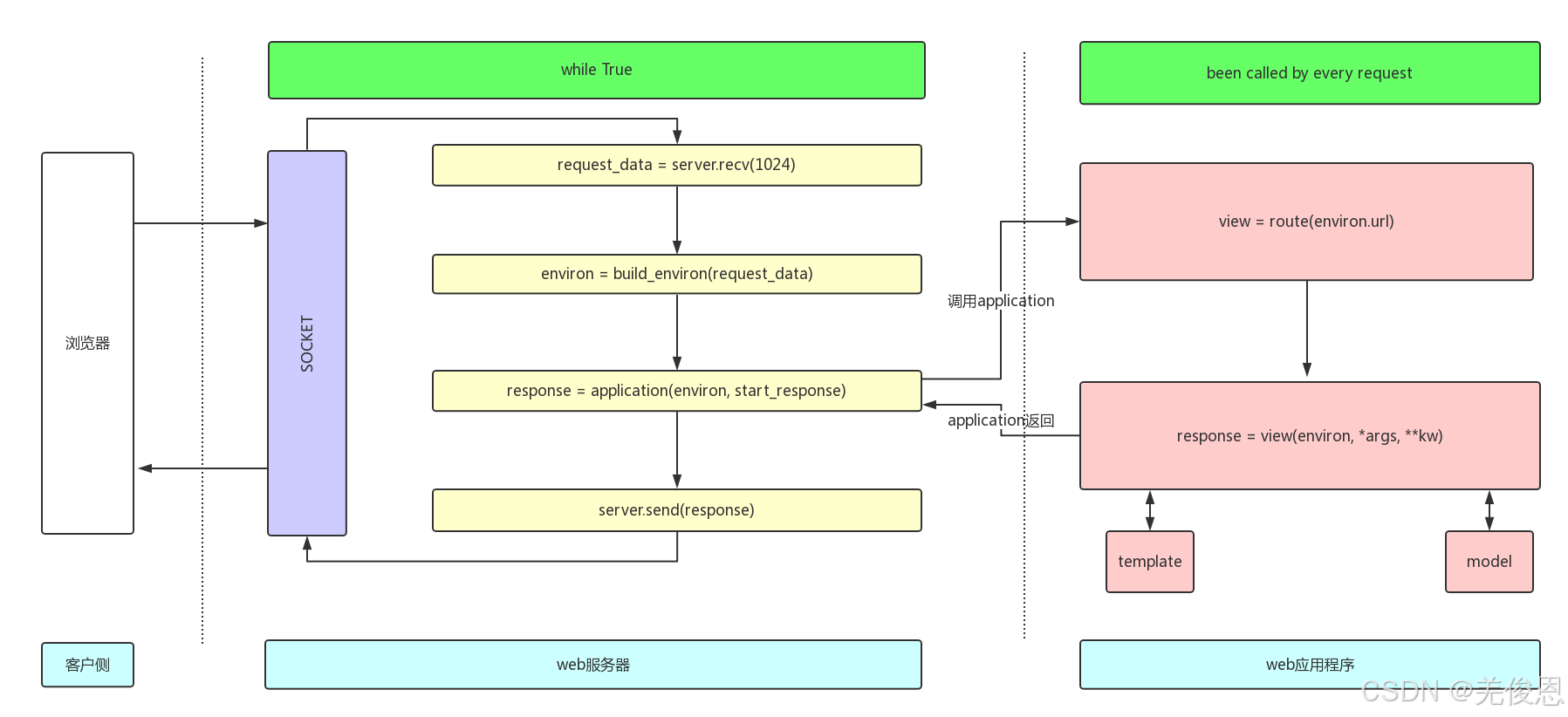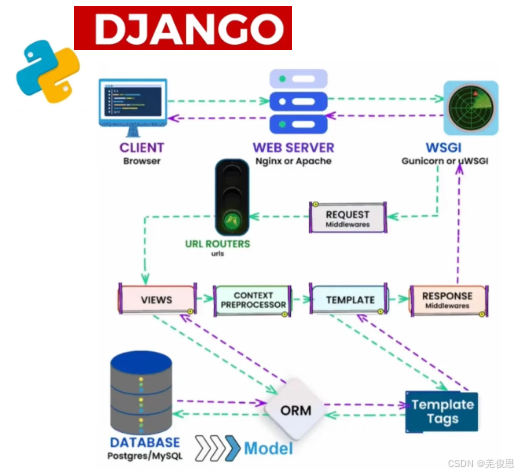 Django 社区活跃繁荣,有丰富的文档,Django已经成为web开发者的首选框架,是一个遵循 MVC(Model、View、Controller) 设计模式的框架,其中控制器接受用户输入的部分由框架自行处理,使用Django框架的URLconf来实现;URLconf机制是使用正则表达式匹配URL,然后调用合适的Python函数处理;Django 里更关注的是模型(Model)、模板(Template)和视图(Views),称为 MTV模式。Django 4.0+ 支持异步视图,Django 5.0+ 更是实现了异步 ORM 查询,彻底解决了长期以来的 I/O 阻塞痛点,使其在高并发场景下的性能得到了质的飞跃。