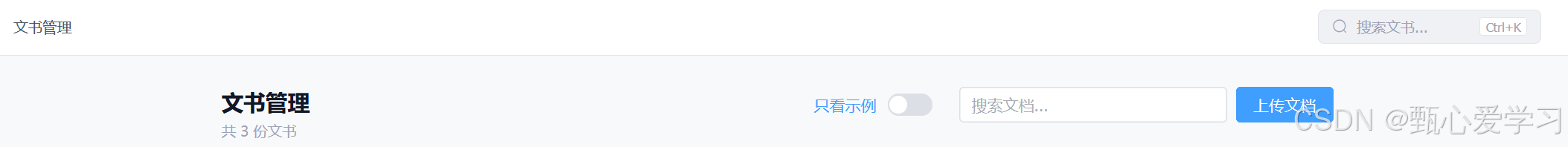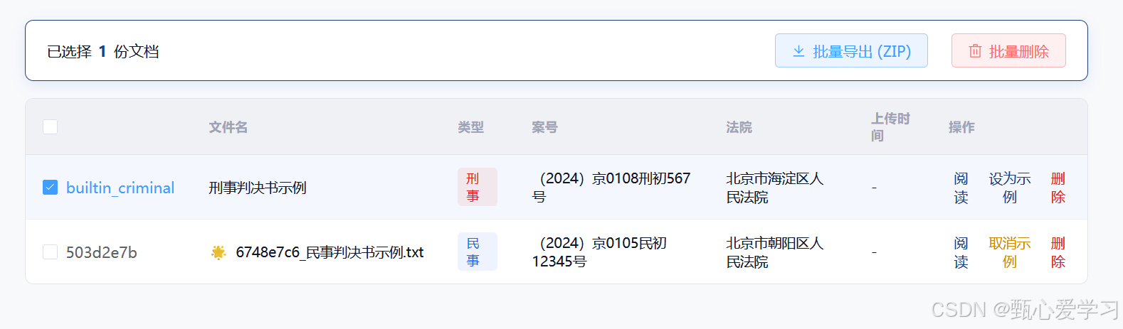 Checkbox(复选框)的列。表头包含全选/反选操作。选中文档后,顶部工作区会浮现"已选择 X 份文档 ------ [批量删除] | [批量导出]"的控制栏。 - 后端支持 :可以直接由前端使用