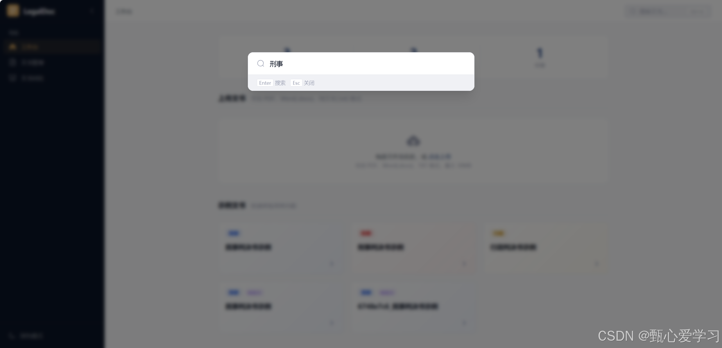 - 方案 A (沉浸式下拉) :彻底抛弃页面跳转。当敲入字符时,直接在这个黑色的弹窗下面延伸拉出结果列表(就像用苹果电脑的聚焦搜索或者手机下拉搜索框一样)。点击想要看的文书后,再单独打开详情或侧边栏,全程不需要离开目前的界面背景。