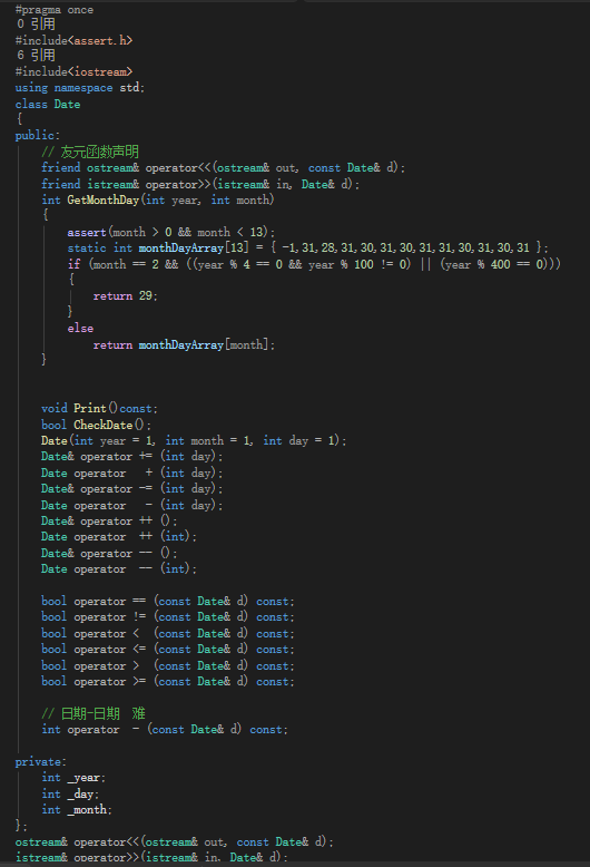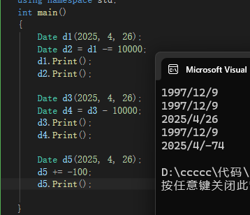 Date Date::operator+(int day) { Date tmp = *this; tmp += day; return tmp ; }8."-="的实现