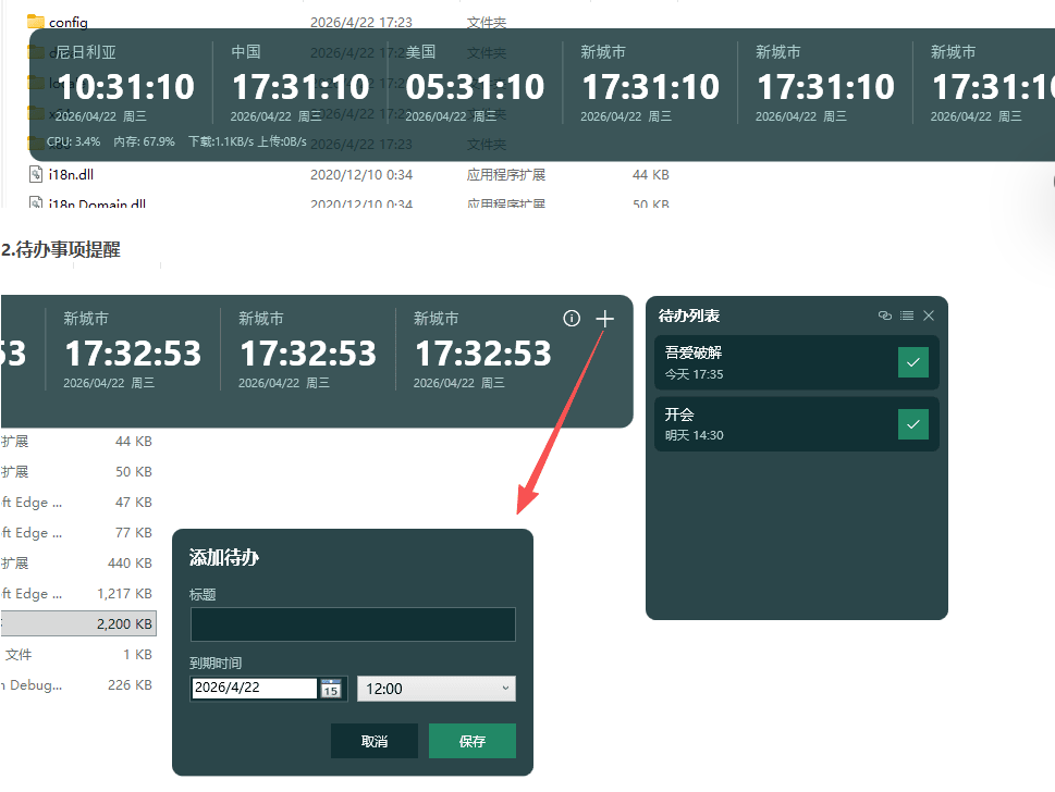 吾爱大神原创工具\] 桌面挂件-世界时钟+待办提醒 v1.0 专为出海贸易而设计 链接:[https://pan.xunlei.com/s/VOqu8lh4E7g7x0ee3oIZObL_A1?pwd=vxxs#](https://pan.xunlei.com/s/VOqu8lh4E7g7x0ee3oIZObL_A1?pwd=vxxs# "https://pan.xunlei.com/s/VOqu8lh4E7g7x0ee3oIZObL_A1?pwd=vxxs#")  平常办公需要,写了个桌面小工具,做出海的必备工具,内置四套皮肤配色,双语版本。