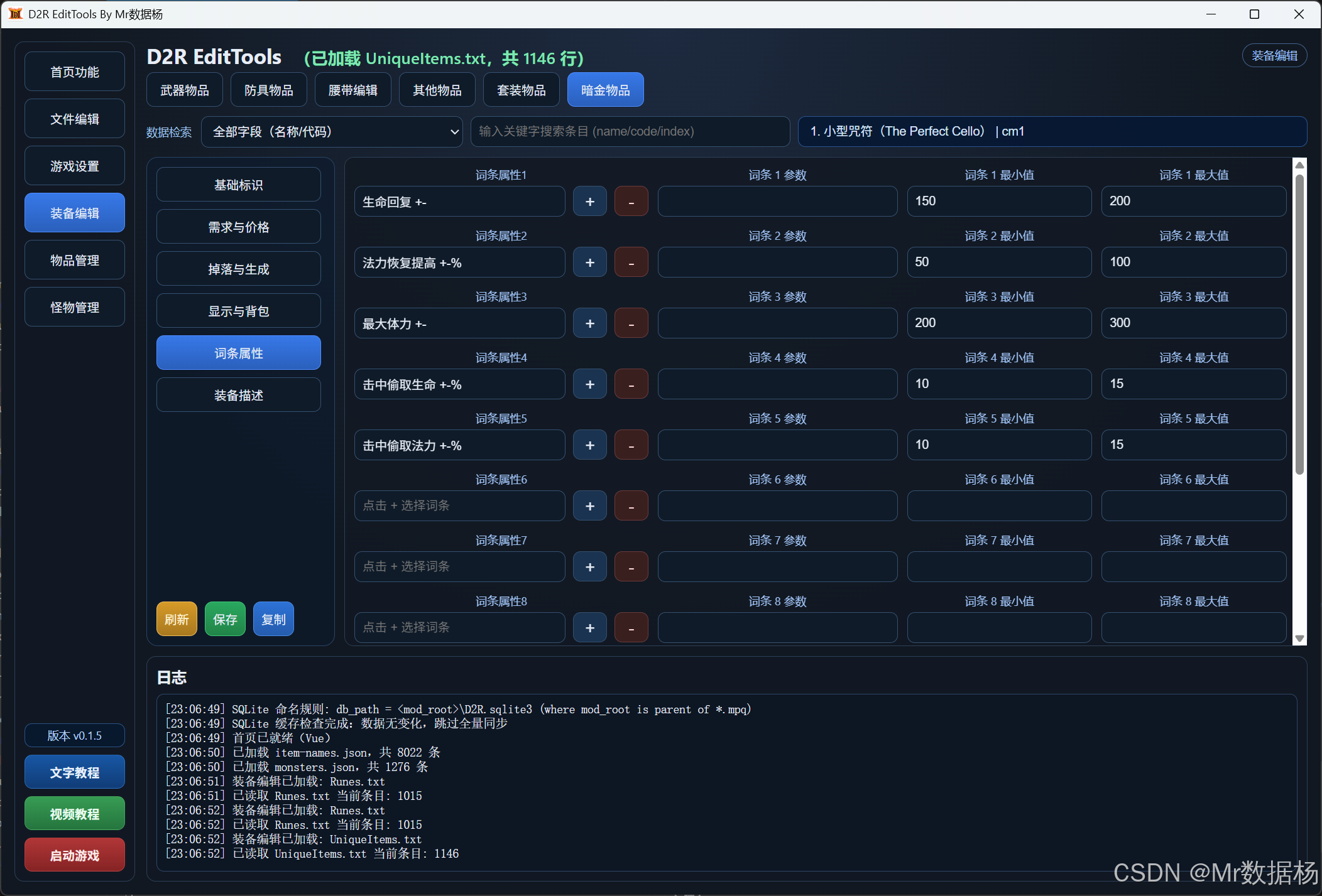 | 暗黑破坏神2 MOD修改工具装备编辑暗金物品 | 讲解暗金物品编辑页的字段展示与保存逻辑。 |