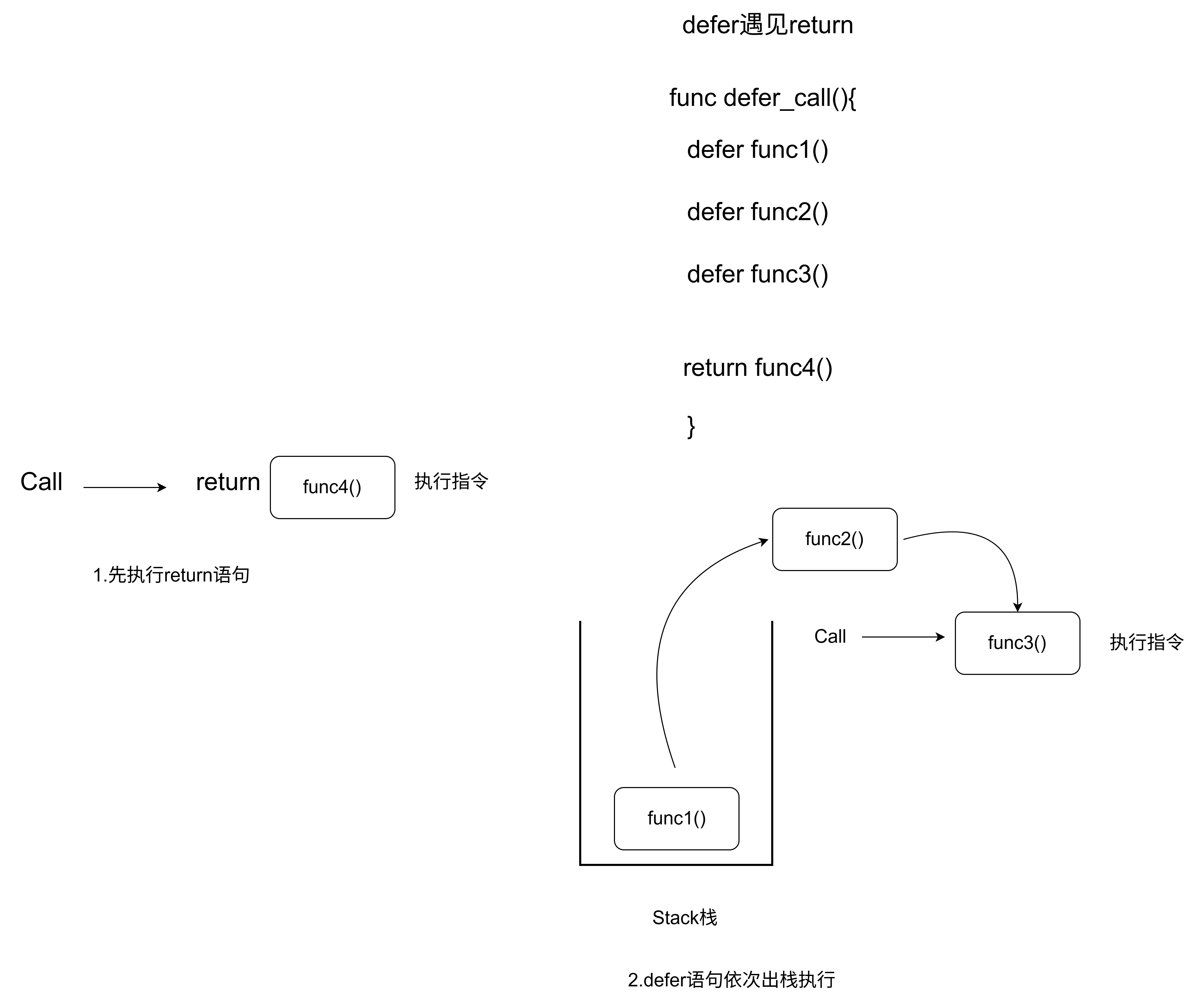 所以func1() func2() func3() 会被一次压入栈中.在入栈的过程中程序不会执行defer后面的表达式.当mian函数执行完之后.被压入栈中的defer表达式会依次出栈并且执行.顺序是弹出一个.执行一次.然后弹出下一个.如图所示.