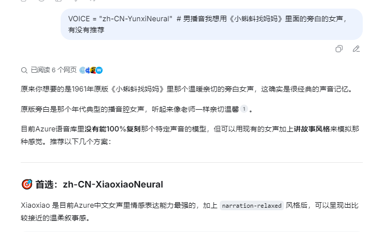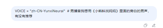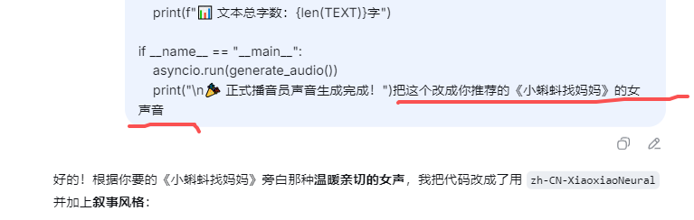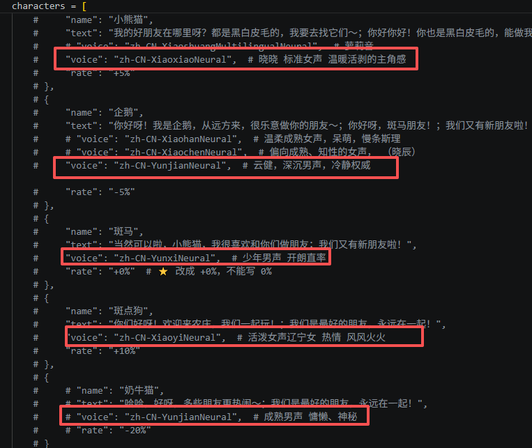# # "voice": "zh-CN-XiaohanNeural", # 温柔成熟女声,呆萌,慢条斯理
