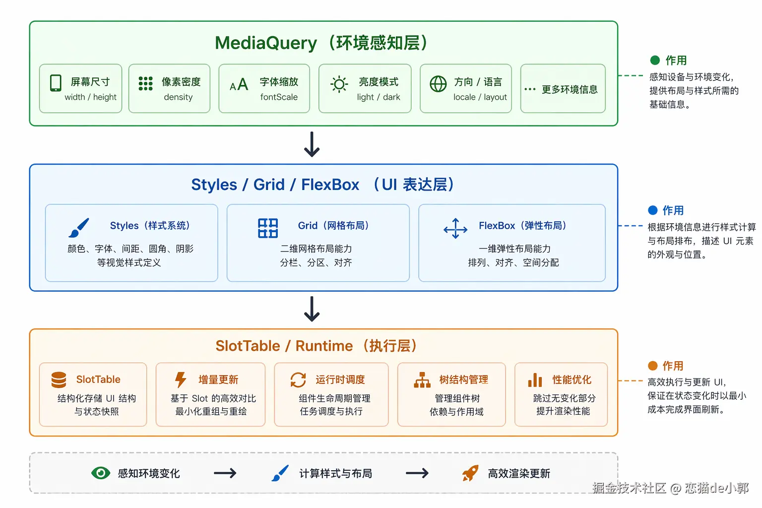 对比前面几个属于 UI 表达,那么 MediaQuery 就是输入条件(环境),MediaQuery 解决的是UI 应该"选哪种形态"的问题,解决的是过去 Compose 感知环境成本相对较高和碎片化的问题。