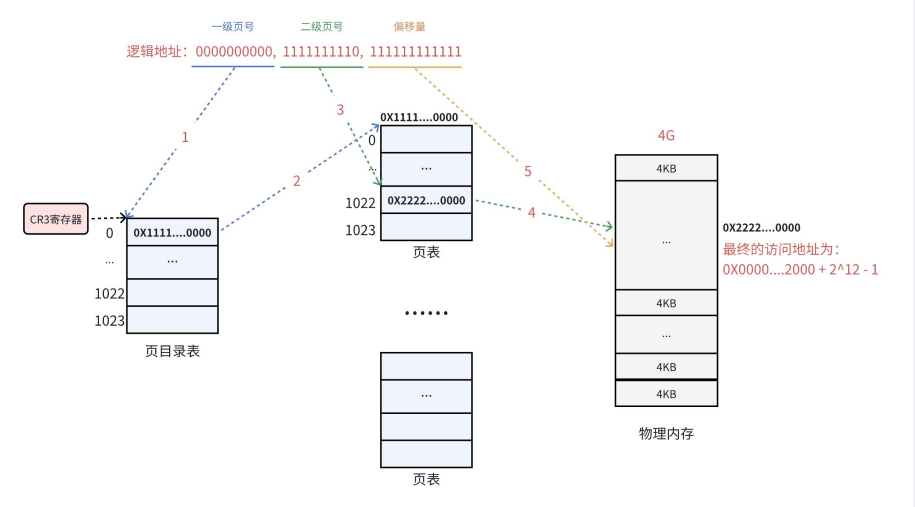 | 结构拆分 | 10 位页目录索引 + 10 位页表索引 + 12 位页内偏移 | 20 位物理页框号 + 12 位页内偏移 |