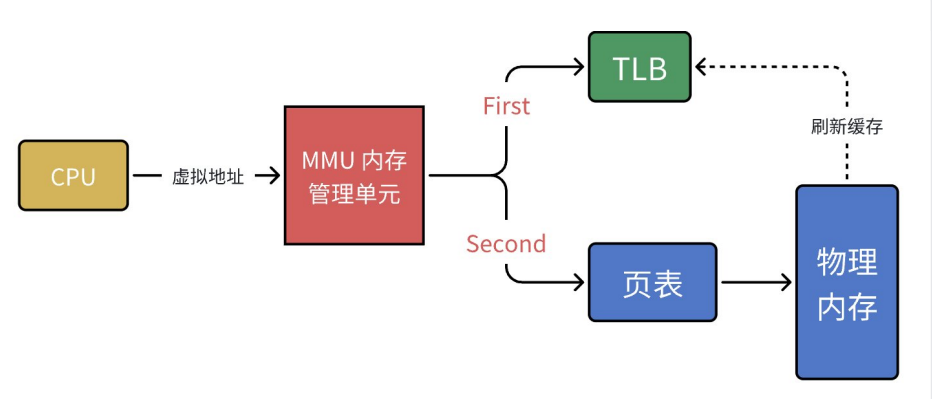 当 CPU 给 MMU 传新虚拟地址之后,MMU 先去问 TLB 那边有没有,如果有就直接拿到物理地址发到总线给内存,齐活。 但 TLB 容量比较小,难免发生 Cache Miss,这时候 MMU 还有保底的老武器------页表,在页表中找到之后 MMU 除了把地址发到总线传给内存,还把这条映射关系给到 TLB,让它记录一下刷新缓存