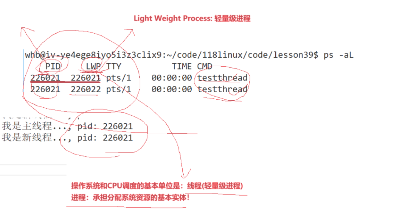 cppwhb@iv-ye4ege8iyo5i3z3clix9:~/code/118linux/code/lesson39$ ps -aL PID LWP TTY TIME CMD 226021 226021 pts/1 00:00:00 testthread 226021 226022 pts/1 00:00:00 testthreadLWP : 轻量级进程 ID(线程 ID,Linux 内核调度的基本单位,每个线程唯一)
