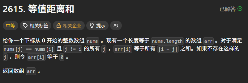 这道题的数据范围达到了 10 5 10^5 105,如果用暴力解法(对每个元素都遍历整个数组找相同值并计算距离和),时间复杂度会是 O ( n 2 ) O(n^2) O(n2),肯定会超时。因此我们需要找一个更高效的方法。