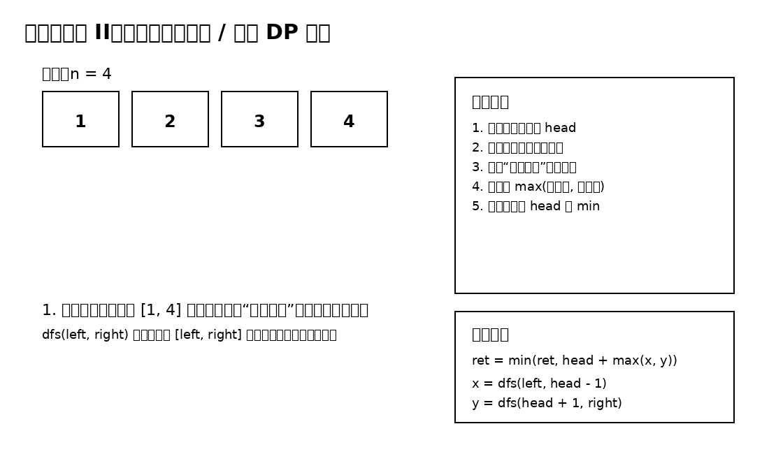 b. 函数体:选择 [left, right] 区间上的任意一个数作为头结点,然后递归分析左右子树.求出所有情况下的最小值;