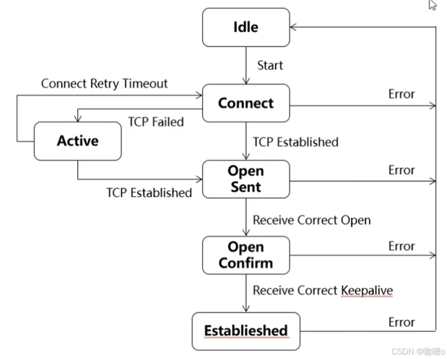 1. Idle:是 BGP 的初始状态,在 Idle 状态下,BGP 拒绝邻居发送的连接请求,也不会向邻居发送 TCP syn,只有 32s 后才会向邻居发送 TCP syn,并且将邻居转为 connect 状态