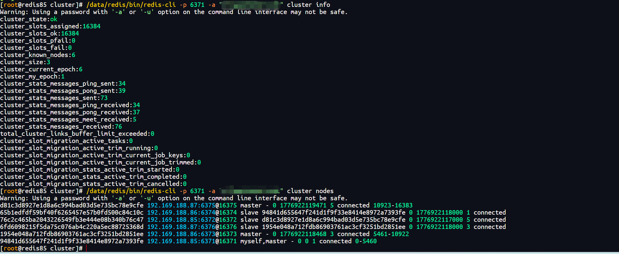 /data/redis/bin/redis-cli -p 6371 -a "YourStrongPassword123!" cluster nodes