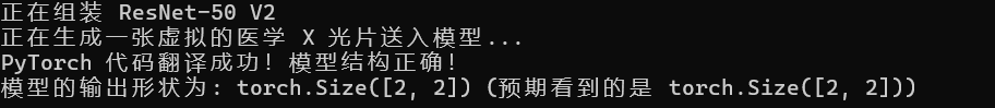[2, 2],代表 2 张图,2 个分类概率),这就证明我们的网络架构在逻辑上 100% 正确,没有维度不匹配的 Bug。