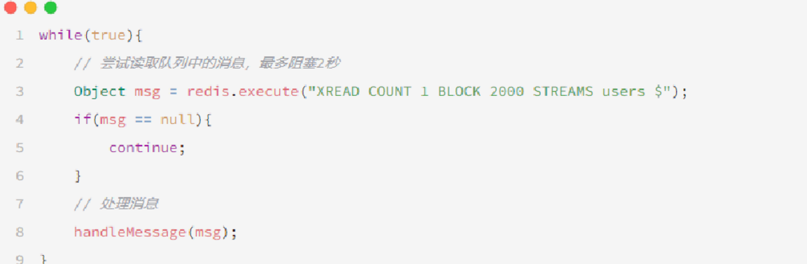 在业务开发中,我们可以循环的调用XREAD阻塞方式来查询最新消息,从而实现持续监听队列的效果,伪代码如下