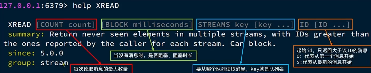 groupName:消费者组名称ID:起始ID标示,$代表队列中最后一个消息,0则代表队列中第一个消息