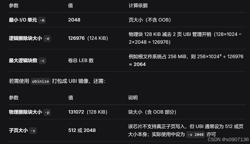 上图中的后两个是关于nand falsh的参数具体说明如下,其中-s项对于不支持子页的flash应填写与页大小相同的数值。