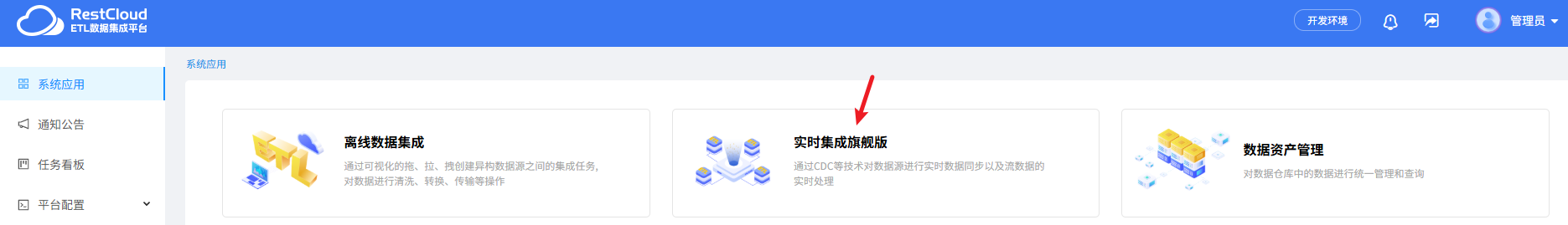 配置完源端与目标端的数据源链接后,我们来配置监听器,来到首页,找到实时集成旗舰版模块。