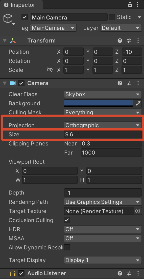 Projection(投影模式):当前为 Orthographic(正交),而 Unity 新建场景时默认是 Perspective(透视)。