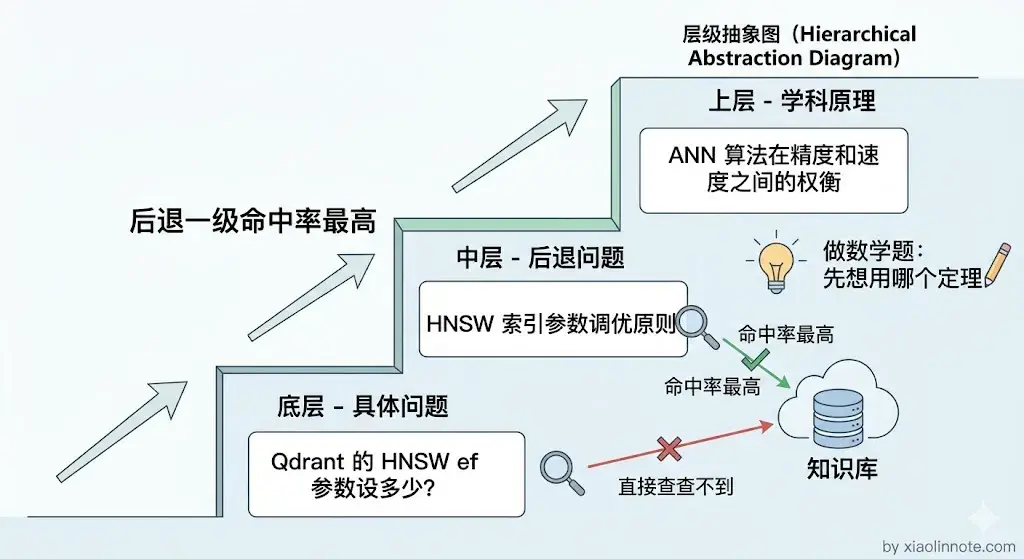 类比一下就很直观:就像你做一道数学题,不是一上来就硬套公式,而是先想想「这道题用的是哪种定理」,再用定理解题。知识库里可能没有「ef 参数设 100 是否合适」的直接答案,但一定有「HNSW 参数调优原则」这样的背景文档,把具体问题后退成背景问题,才能找到真正有用的参考资料。