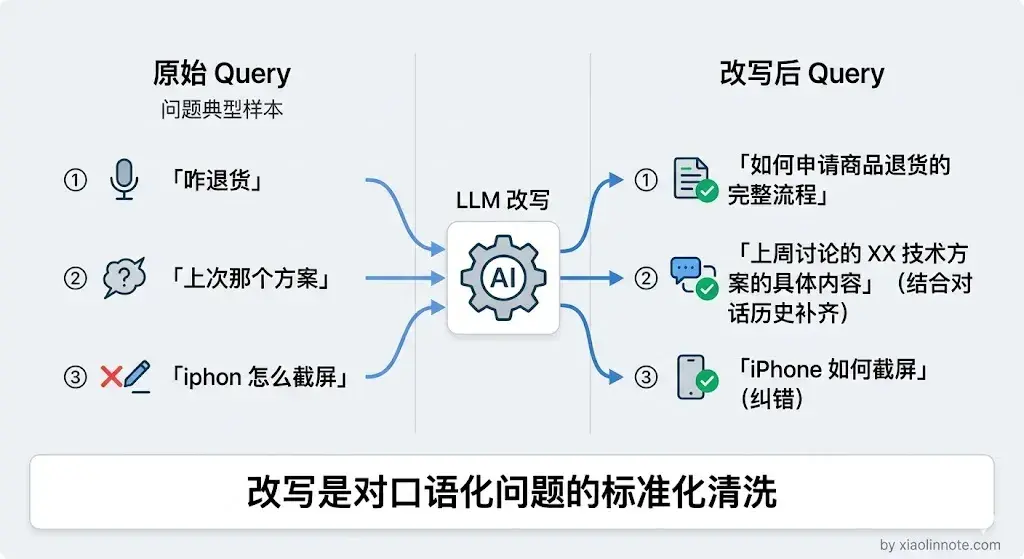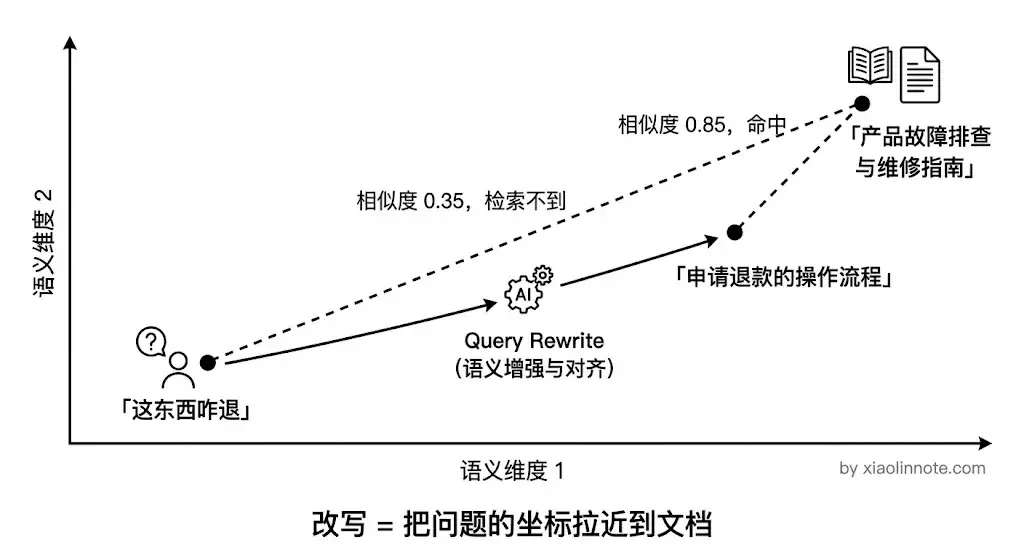 表述鸿沟最简单的形态,就是口语化。把口语化、模糊的问题改写成更精准、更书面化的检索表述,这就是最基础的改写方式。改写的本质是消除口语化表达和书面知识库表述之间的向量距离,「这东西咋退」和「申请退款的操作流程」在向量空间里不是同一个邻居,改写就是把前者的向量拉近到后者。同时还可以补全上下文,处理代词指代(「这个功能」改写成具体功能名称),让多轮对话中的模糊引用变成检索可识别的具体词汇。