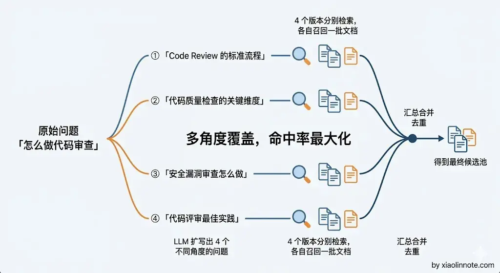 前面三种方法都是在「一个问题」上做文章------要么改写它、要么给它配一个假设答案、要么把它抽象化。但有时候问题的角度本身就比较窄,用一个角度去检索,覆盖面不够。这时候就需要换个思路:不求一个问题改得更好,而是多生成几个不同角度的问题。