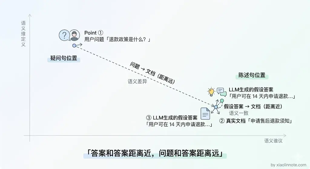 直接改写能解决口语化和指代不清的问题,但还有另一种鸿沟是改写搞不定的,问题和文档本来就是不同的文体,一个是疑问句,一个是陈述句,就算你把问题改写得再规范,它在向量空间里还是「问句」的坐标,而文档是「陈述句」的坐标,两类文体之间天然有距离。