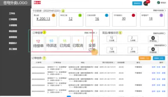 工作台展示的数据:今日数据;订单管理;菜品/套餐总览;订单信息。