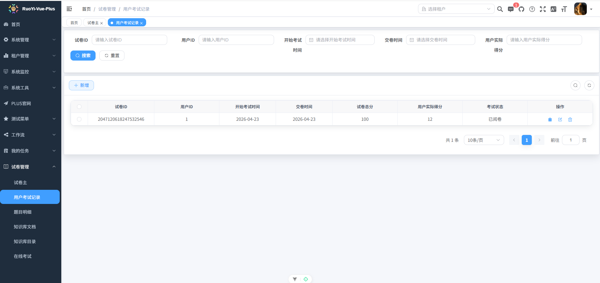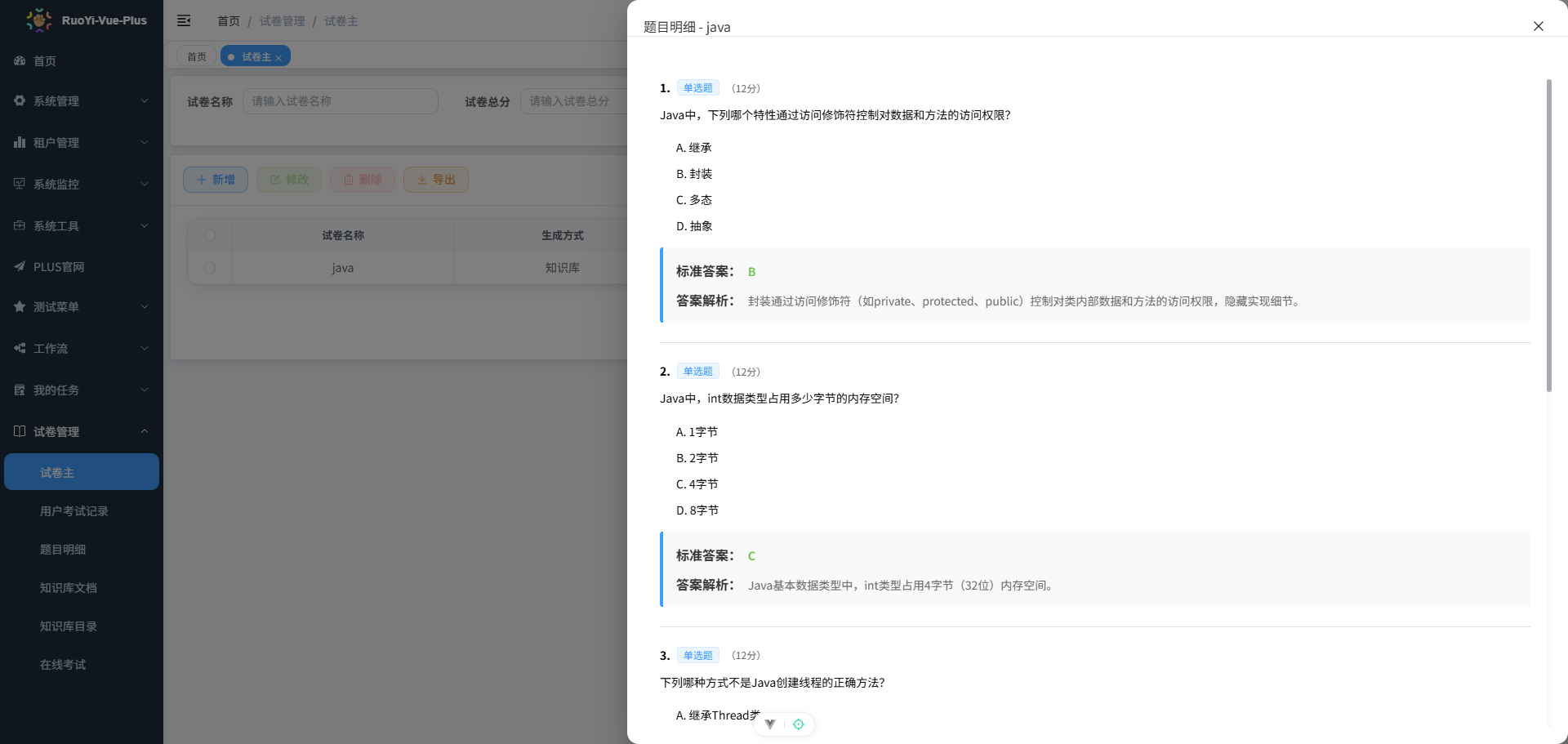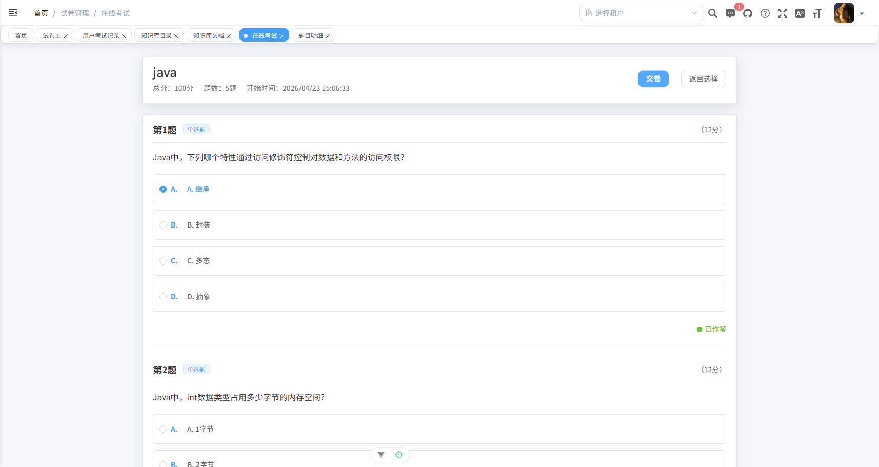 - AI 智能生成试卷:根据知识库内容或用户自由描述,自动生成包含单选、多选、文本题的试卷,并自动分配分值。