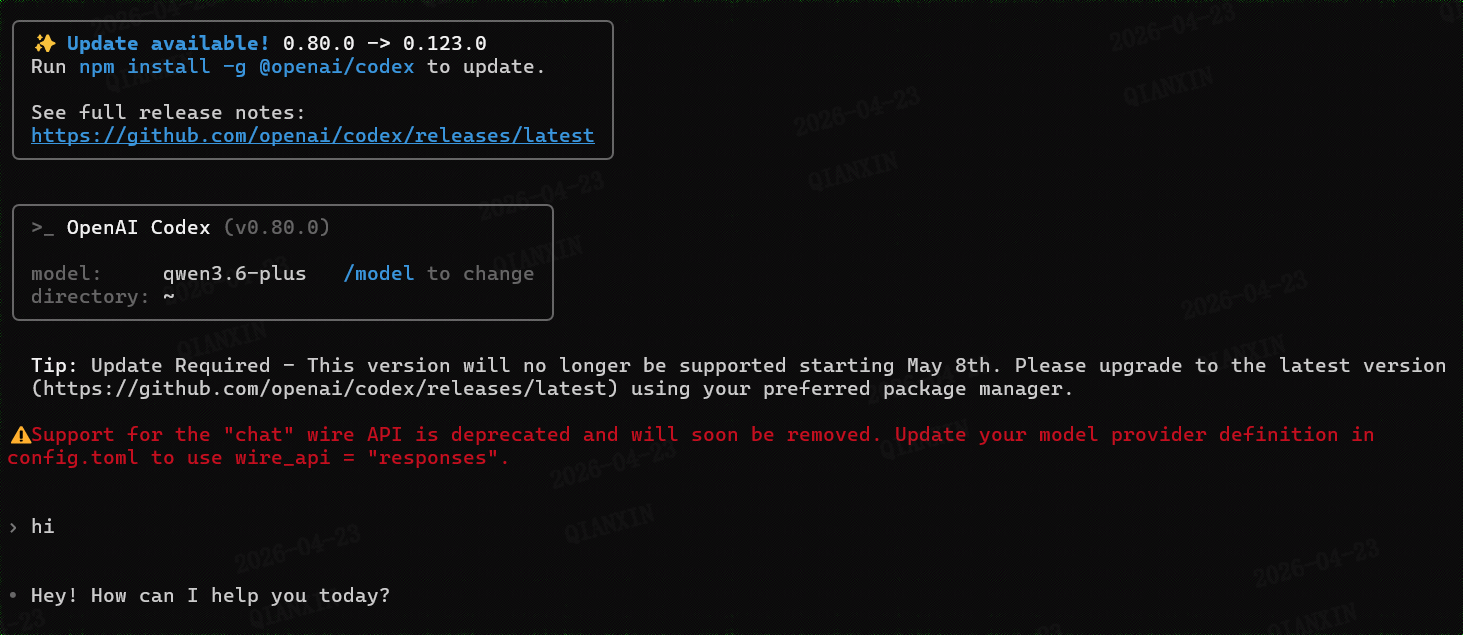 根据参考1,将"阿里云百炼Coding Plan"接入codex,配置完成后,启动codex时,报错如下: