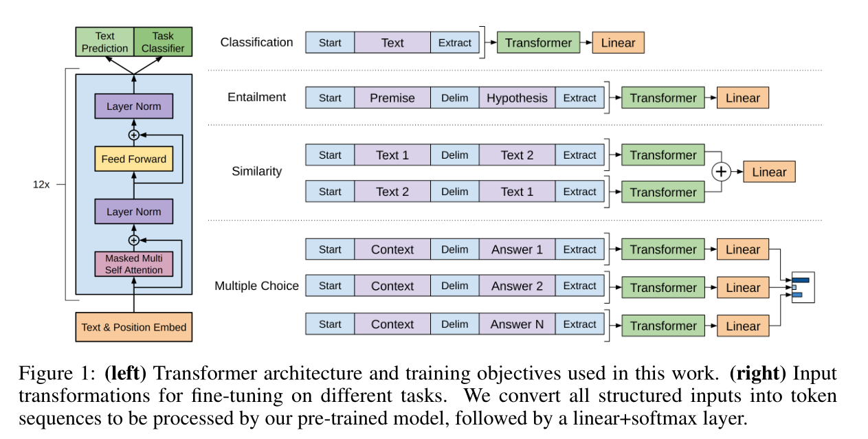 - 优化目标不明确:在从无标签文本中学习有用的信息时,过去并不清楚哪种优化目标(如语言建模、机器翻译或语篇连贯性)最能有效地学习出易于迁移的文本表示。
