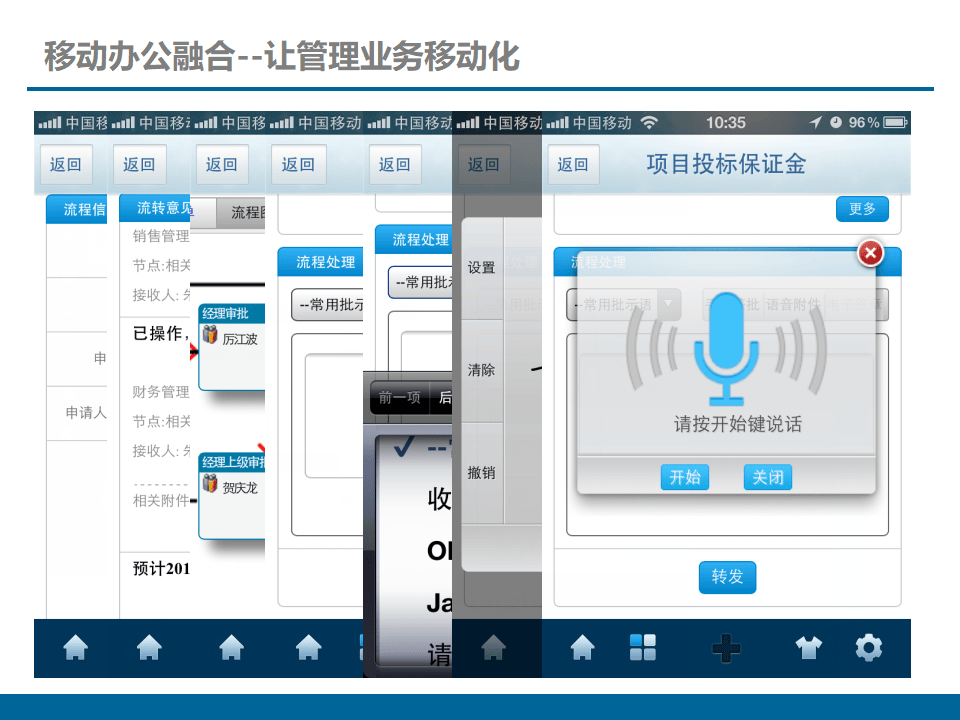 方案中移动办公的设计理念是**"Anytime Anywhere,掌握资讯,处理流程"**,支持iOS和Android,与PC共享所有办公应用成果,不是PC端的补充,而是与PC端对等的完整工作平台。