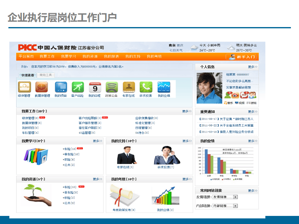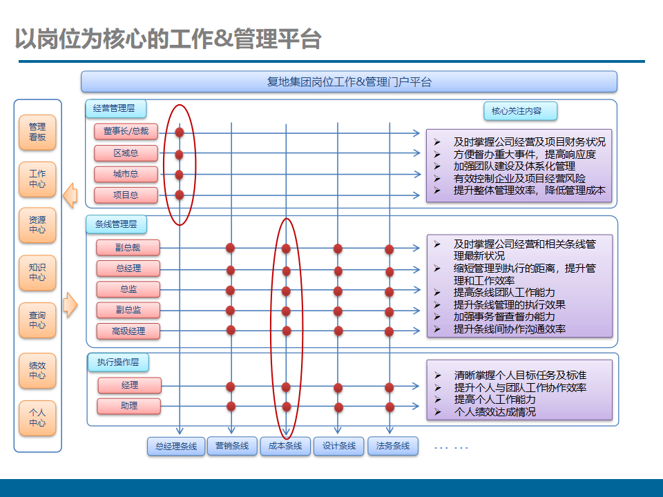 方案把岗位人员分为三个层次:决策层(董事长、总裁、区域总)、管理层(各条线总监、经理)、执行层(员工)。三个层次的门户,呈现的内容和功能完全不同: