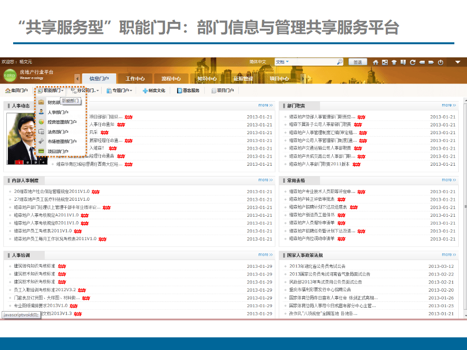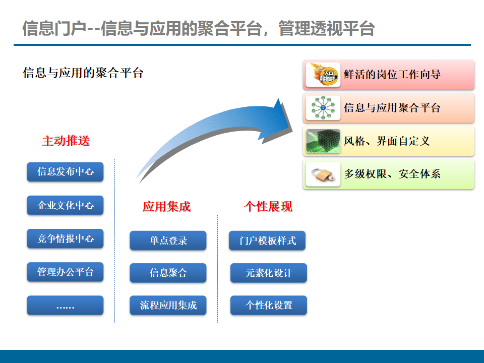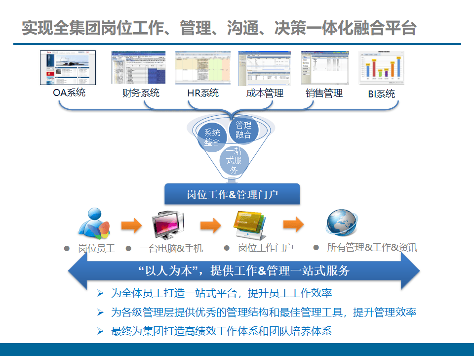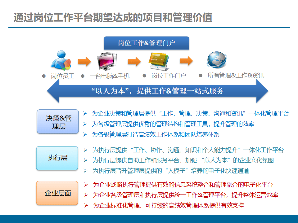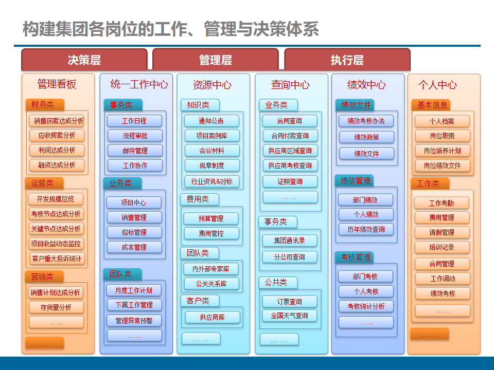 它的管理定位是:为集团决策层、管理层和全员提供资讯、知识、工作、管理、沟通、决策一体化平台。