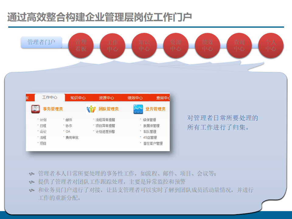- 管理层门户:聚焦条线管理,提供团队工作跟踪、异常预警、绩效监控,同时兼顾日常事务处理