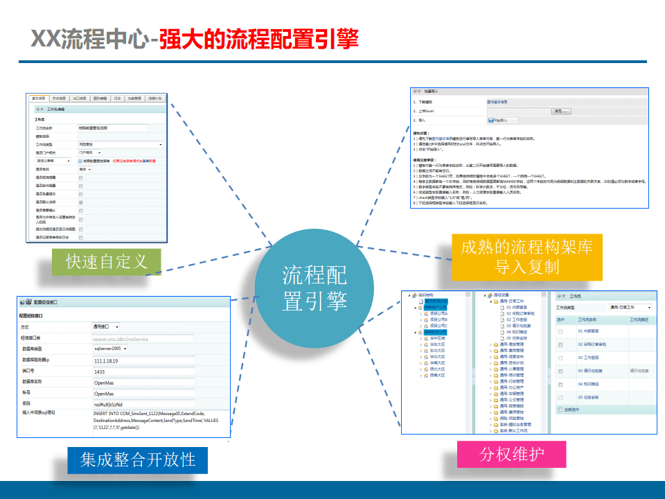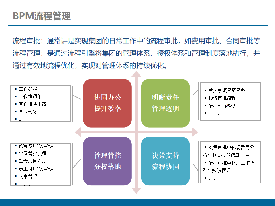 - 分权维护机制:集团总部配置基础规则,各板块在规则框架内自主维护本板块流程,不需要什么改动都找IT