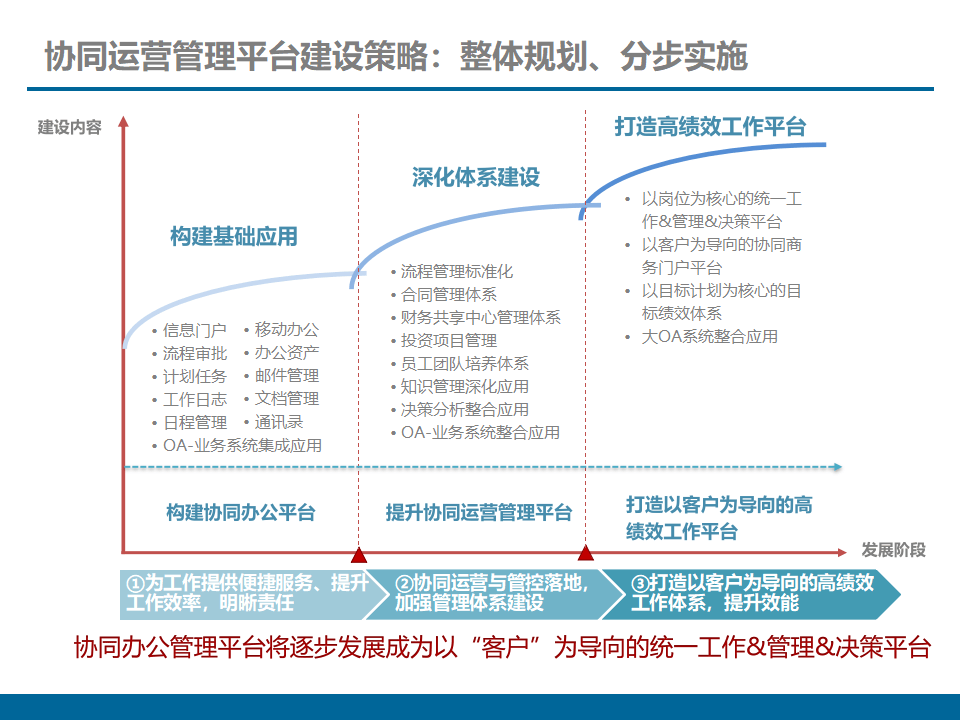 系统维度:按"系统平台建设→业务应用建设"的顺序推进。先把底层的门户平台、流程引擎、权限体系建好,再在稳固的平台基础上叠加业务应用。很多项目失败,恰恰是急于上业务功能,底层平台没建好,后期每增加一个功能就要一番折腾。