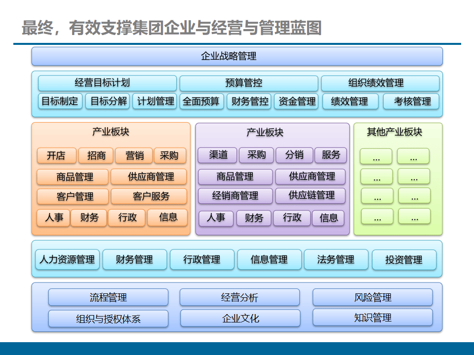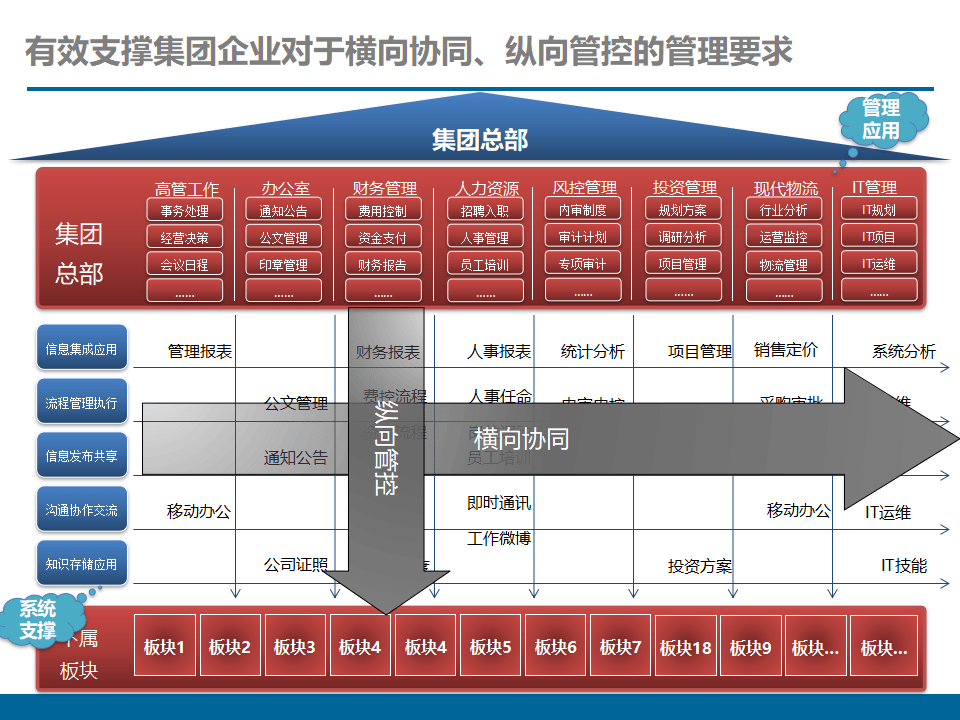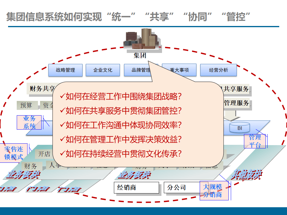 第一个诉求是统一管控------战略要统一执行,财务要统一管理,风险要统一管控,品牌要统一呈现。集团要能随时知道下面的板块在干什么、钱花到哪里去了、合同审批有没有走正规流程。