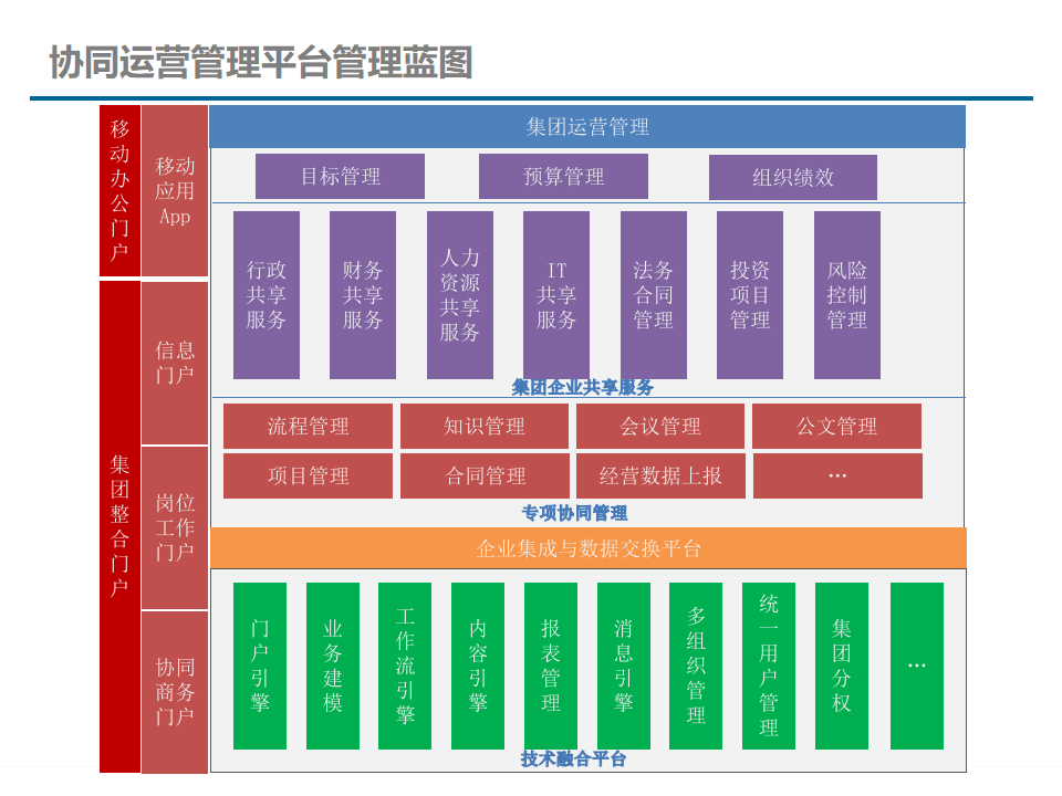 - 协同管理拓展应用:项目管理、合同管理、知识管理、财务共享中心、经营分析整合