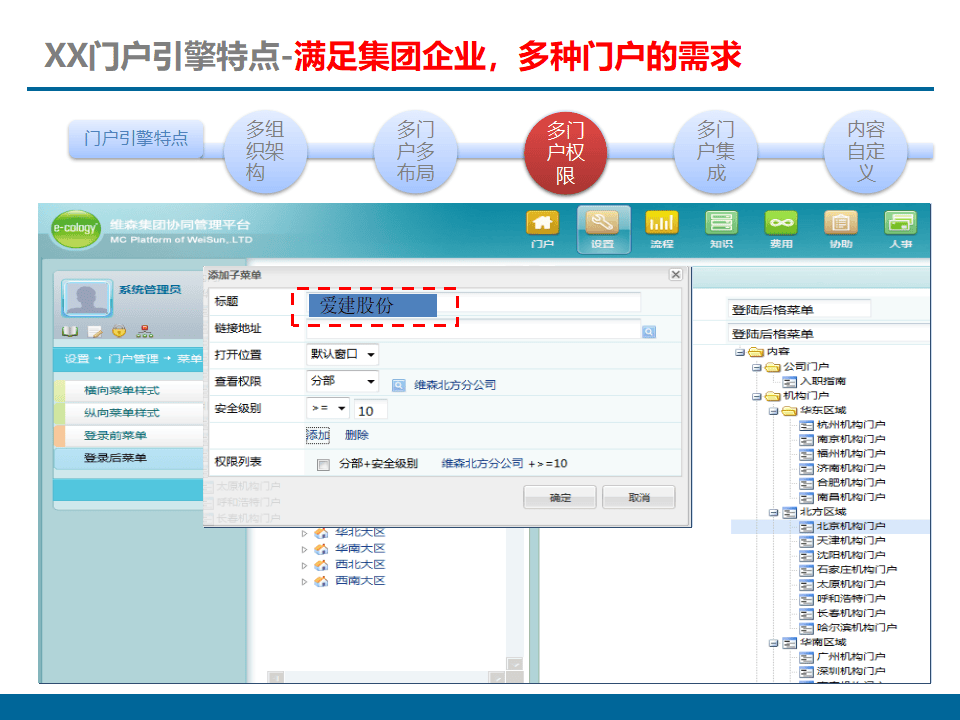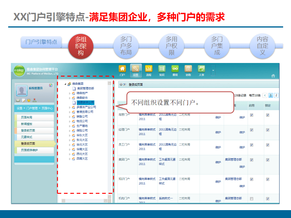 - 门户引擎:支持多组织架构、多门户多布局、多用户权限、内容自定义