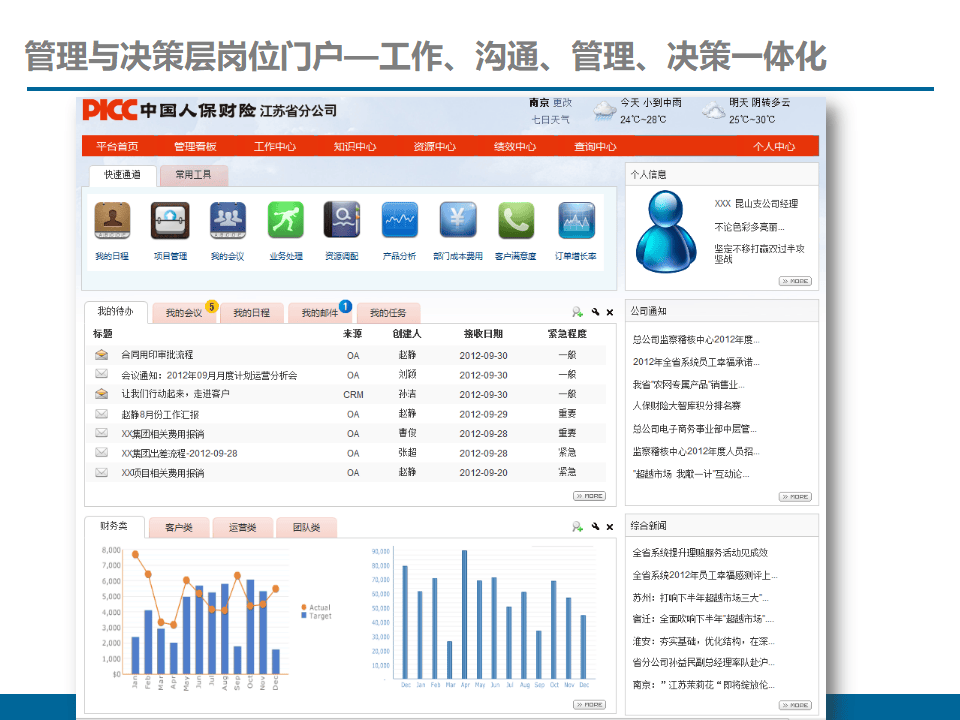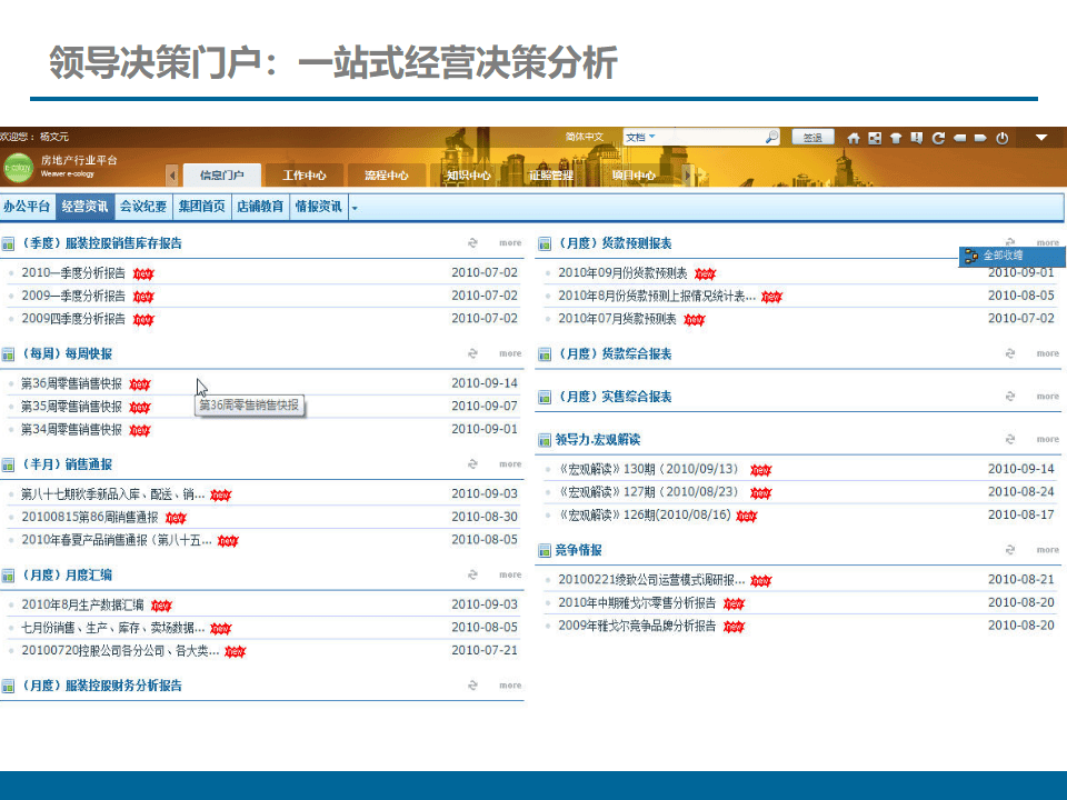 - 决策层门户:以经营分析、管理看板、重大事项督办为核心,帮助高层快速掌握全局经营状况,一站式完成经营决策