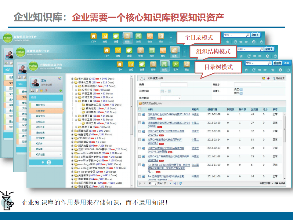 方案的设计思路是:从工作过程中自动沉淀知识。收文发文、会议管理、流程审批、协作沟通、计划任务、工作汇报------这些日常工作活动,都是知识的来源。系统在员工做这些事情的同时,自动将有价值的内容归类存入知识库。