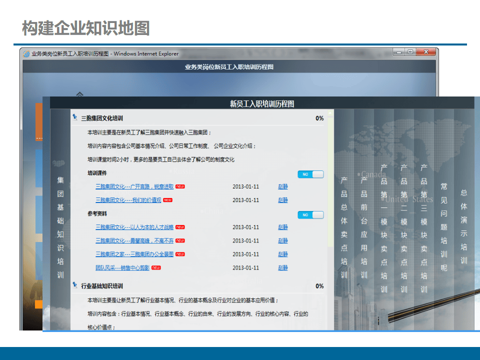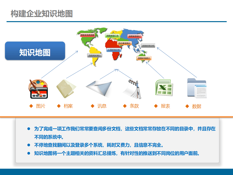 知识地图是解决这个问题的有效工具。它将一个主题相关的所有资料------文档、图片、数据、条款、报表------汇总提炼,有针对性地推送到不同岗位用户面前。