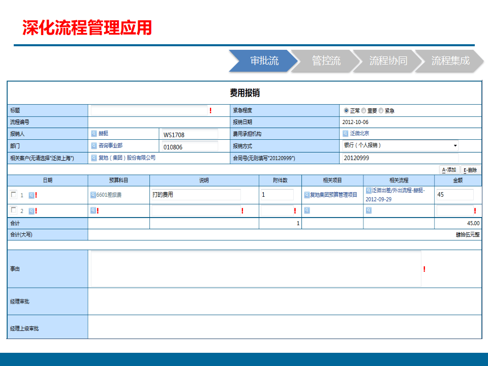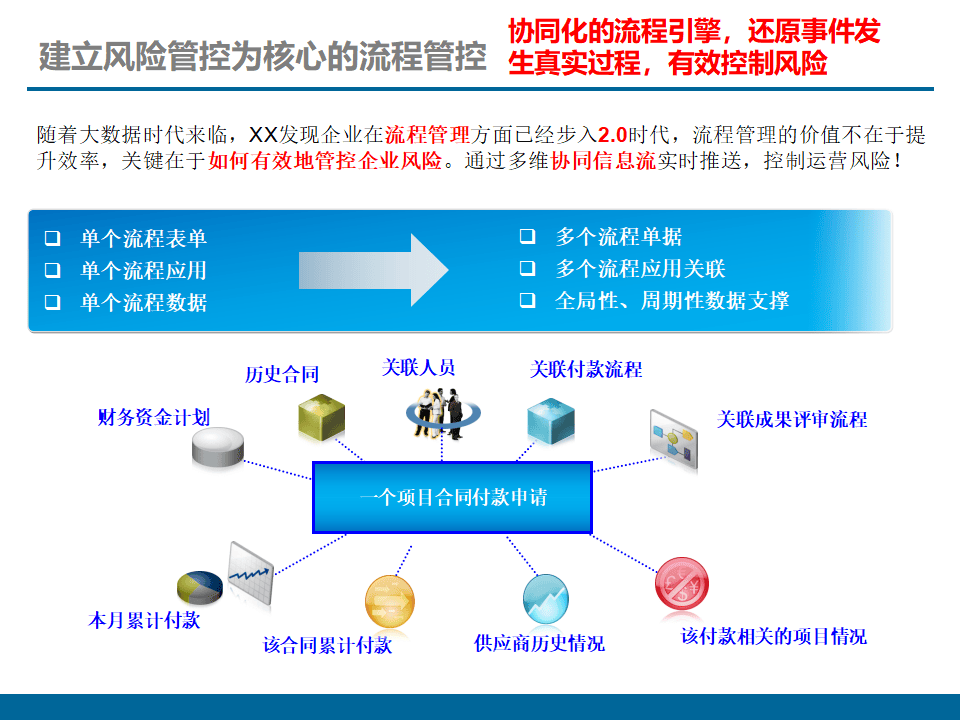 方案中提出了一个非常有洞见的判断:流程管理已经步入2.0时代,流程管理的价值不在于提升效率,关键在于如何有效地管控企业风险。