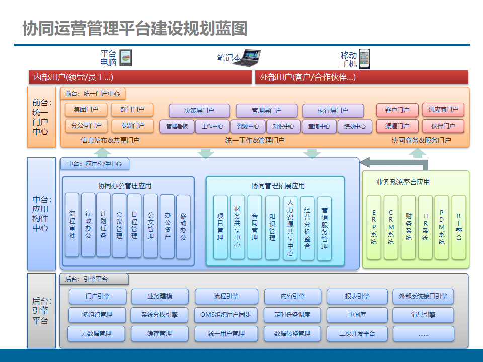 整个协同运营管理平台,在技术架构上采用前台---中台---后台的三层结构,这是目前大型企业信息化建设的主流架构思路。