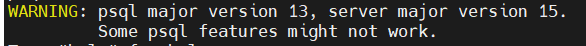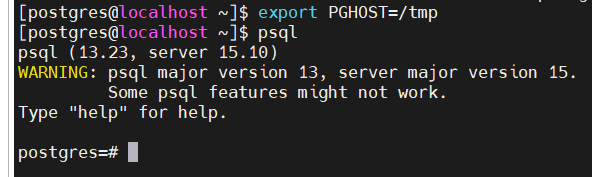 root@localhost \~\]# find / -name "\*s.PGSQL.5432\*" /tmp/.s.PGSQL.5432.lock /tmp/.s.PGSQL.5432 1.2.2 声明变量,psql登录,如下图 export PGHOST=/tmp psql  或者执行如下命名 psql -h /tmp/ postgres ## 2.psql命令行和当前版本不一致 ### 2.1 如下报错: WARNING: psql major version 13, server major version 15. Some psql features might not work.  2.2 原因和解决方法 主要是装过早期版本的pgsql,需要清理软连接 which -a psql 会显示所有的psql 把不需要的软连接清除,比如/usr/bin和/bin下的 只剩下/usr/local/psql/bin下的最新版本,再次使用psql即可正确