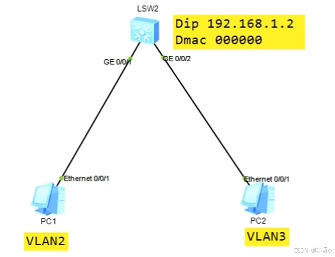 PC1测试PC2的连通性,PC1 发送自己的 IP 地址和 MAC 地址以及需要访问的 IP 地址和 MAC (00000000) 地址,网关查找路由表,此时网关启用了 ARP 代理,所以使用自己 vlan 4 的 MAC 地址代理 PC1 的 MAC 地址,PC2 收到请求之后,回应自己的 MAC 地址,网关同样的使用自己的 vlan 4 的 MAC 地址代理 PC2 的 MAC,PC1 收到之后,将 PC2 的IP地址 和 网关 vlan 4 的 MAC 存入自己的 ARP 表项中,误认为此时的 MAC 就是 PC2 的 MAC,同理 PC2 也是。
