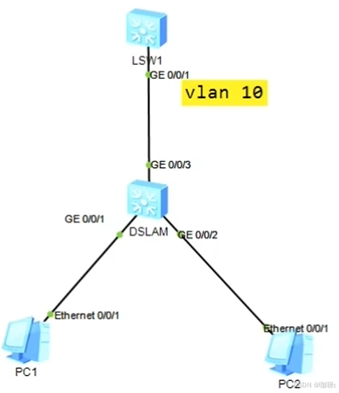 LSW1配置接口类型为 access 并允许 vlan 10 通过,配置 vlan 内 ARP 代理