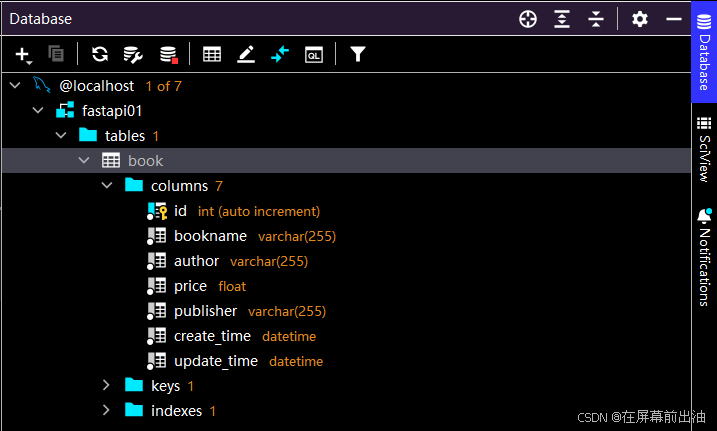 填写好 user 和 password,点击 ok。就能在右侧边栏的 Database 中看到在 fastapi01 里面创建的 book 表格了: