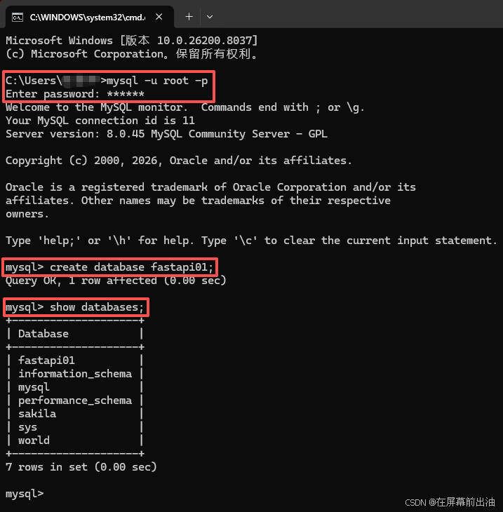 输入密码后进入 MySQL。使用以下命令创建数据库: